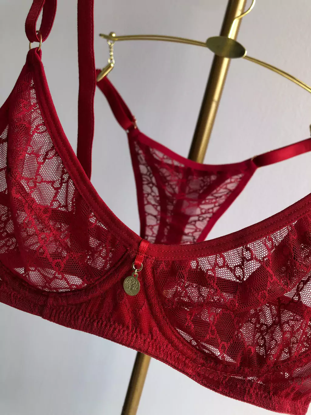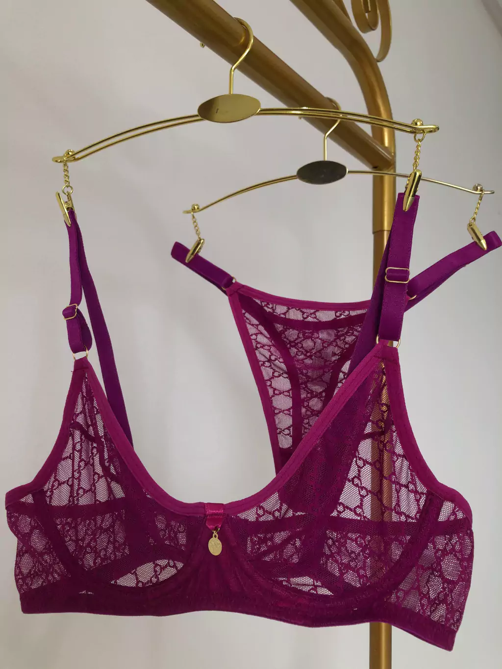 - Conjunto composto por sutiã e calcinha feitos em renda delicada e tule com padrões geométricos.